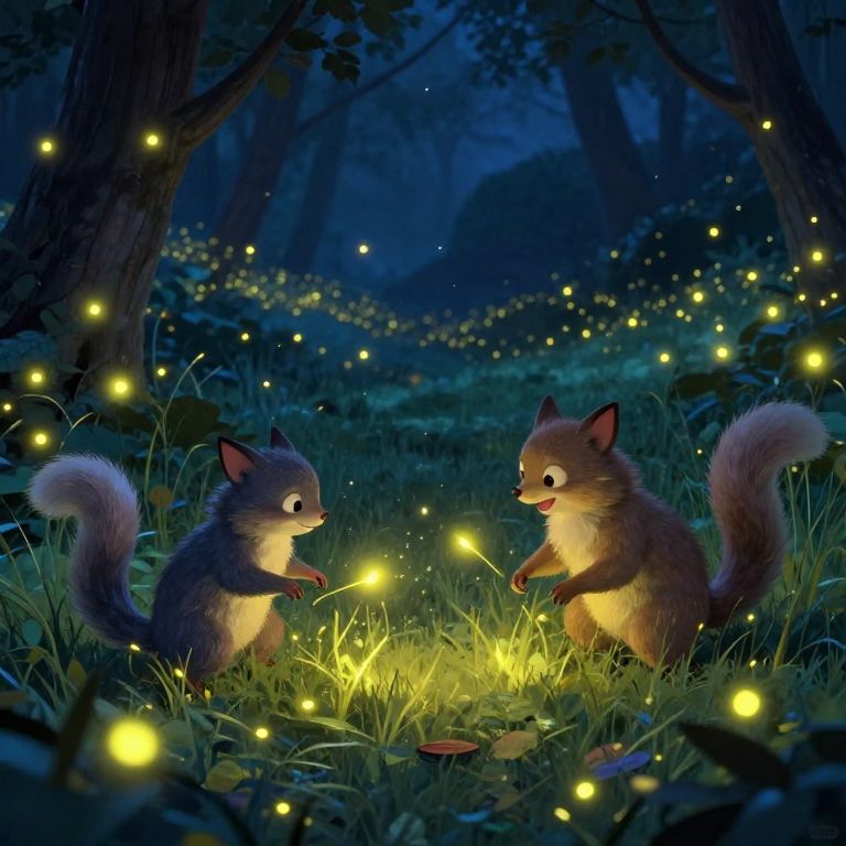 Nighttime scene of mischevious animals playing tricks with glowing fireflies in a magical meadow, mystical lights, soft pastel colors, detailed wildlife elements, enchanting and fun mood