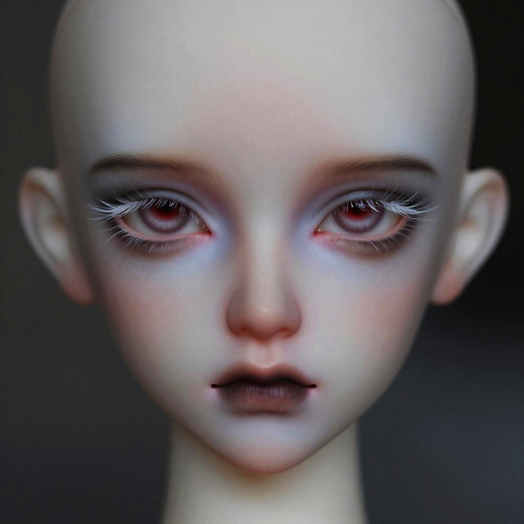 Close-up portrait of a red eyes albino character with strikingly pale skin and white eyelashes, intense gaze focusing on the viewer, detailed textures on skin and eyes, moody background with subtle fog, cinematic lighting emphasizing the eyes.