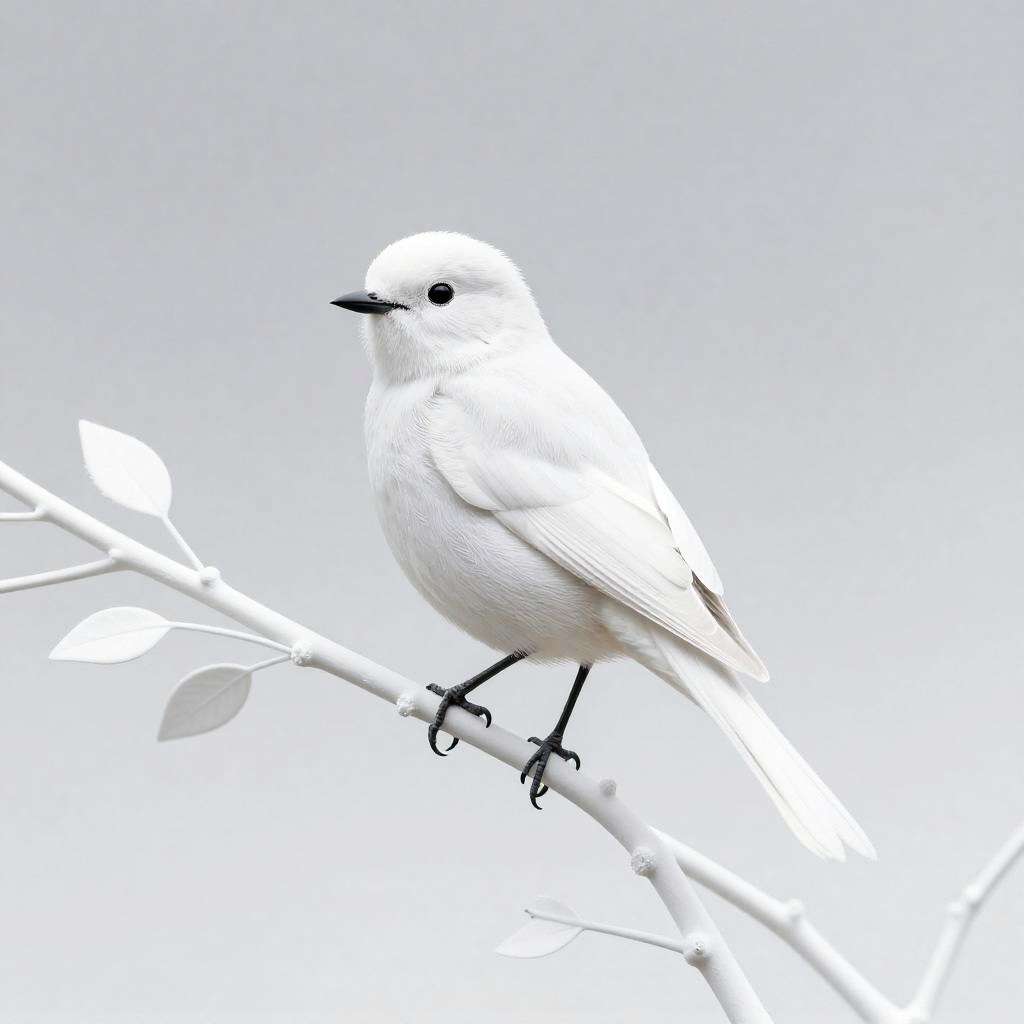 This digital artwork features a sleek, white bird perched on a delicate, leafless, white branch. The bird has a small, black eye and fine, detailed feathers. The background is a gradient of soft gray to white, giving a minimalist, ethereal feel. The clean lines and monochromatic palette create a serene, almost dreamlike atmosphere. The bird's posture is calm and poised.