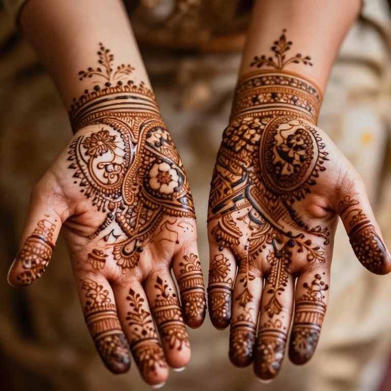 Show off body art on a close-up of hands and arms covered in intricate henna and mehndi designs, high resolution, warm earthy tones, cultural richness, textured skin and patterns, intimate and artistic photography style.