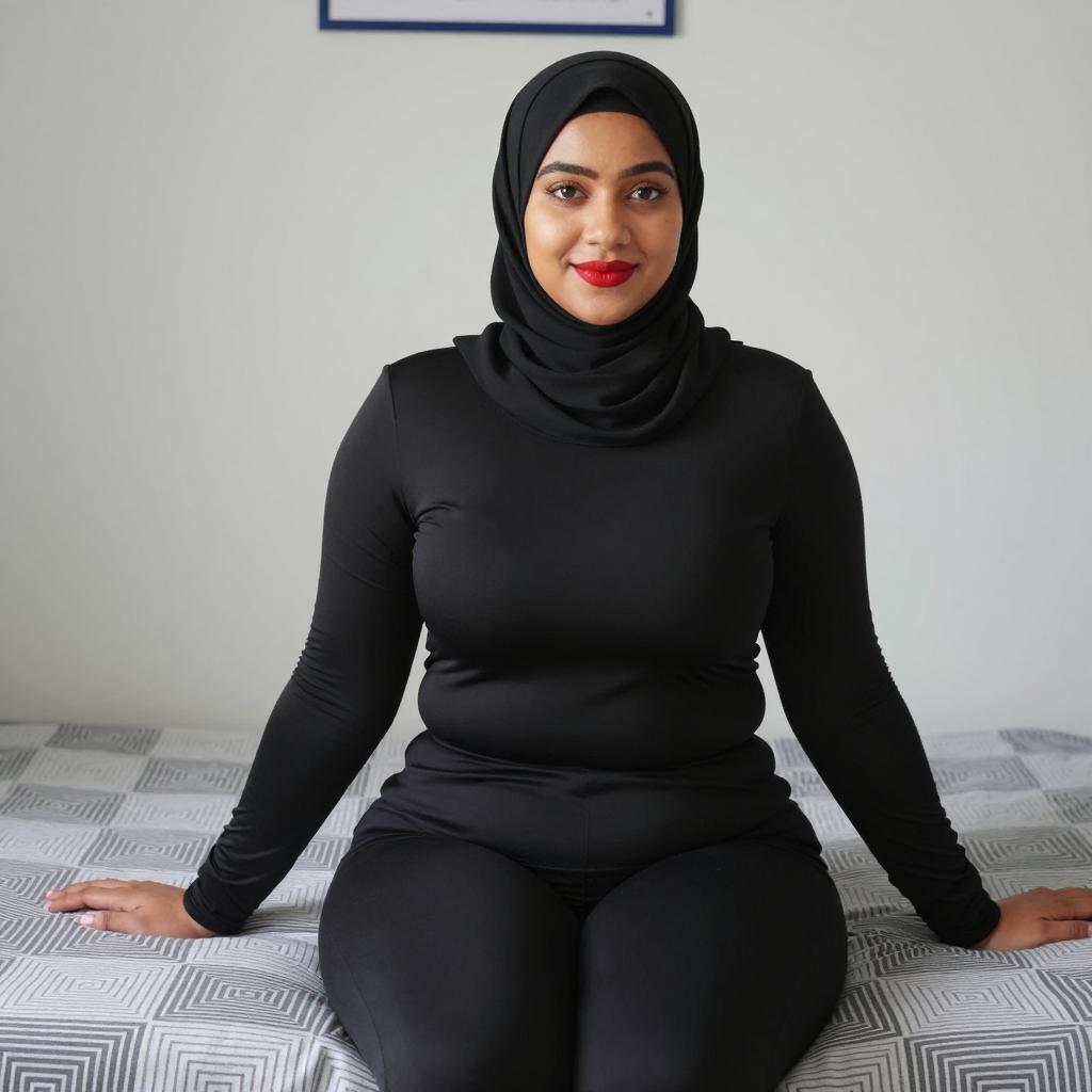 Photograph of a woman with long black hair in a black hijab, wearing a tight, long-sleeved, mustard-yellow dress with a high slit, bending forward, smiling. She has a curvy body, large buttocks, and is wearing nude high heels. Background includes a modern house with dark walls, green grass, and palm plants. Sunlight is in the background, creating a soft glow. She has light skin and is looking back over her shoulder. There is a small white in the bottom right corner.