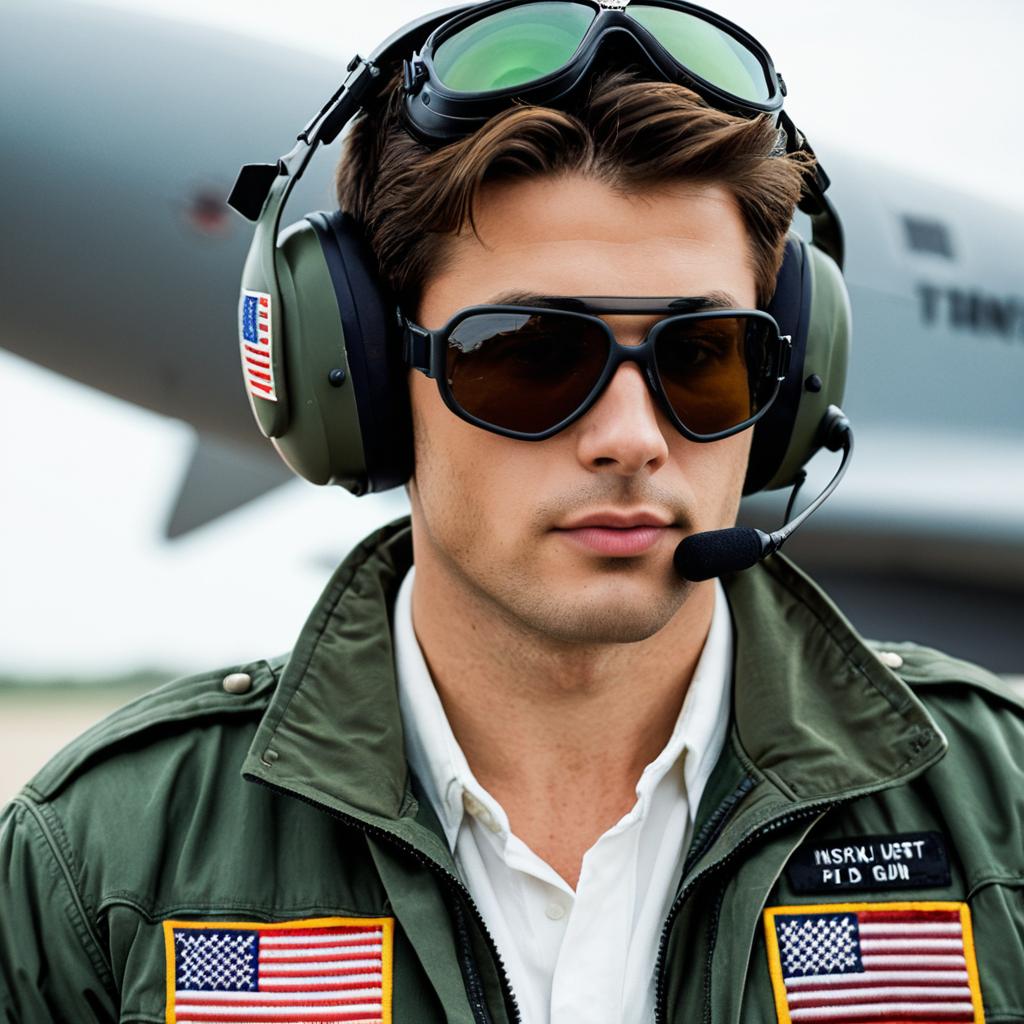 Top gun pilot costume man ,1boy, male focus, american flag, solo, realistic, goggles, pilot, military, aircraft, shirt, headset, jacket, airplane, brown hair, patch, looking at viewer, upper body, white shirt, blurry background, blurry, united states, green jacket