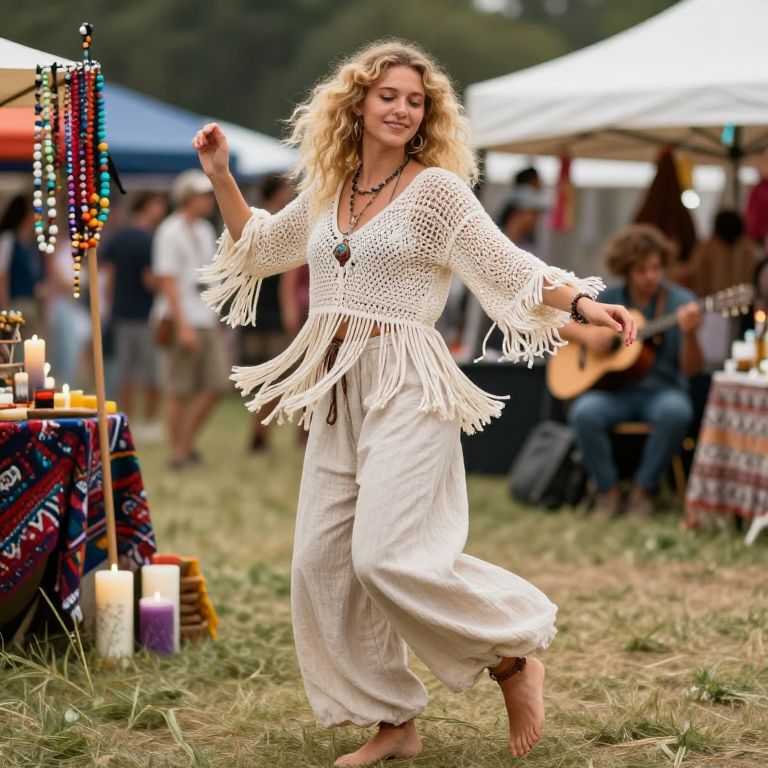 A cheerful festival boho girl with curly blonde hair and gentle green eyes, dressed in a flowing fringe crochet jumper and wide-legged linen pants, dancing barefoot in a colorful outdoor market with handmade beads, handmade candles, and folk music playing in the background, embodying a free spirit in the joyful chaos of a summer festival.