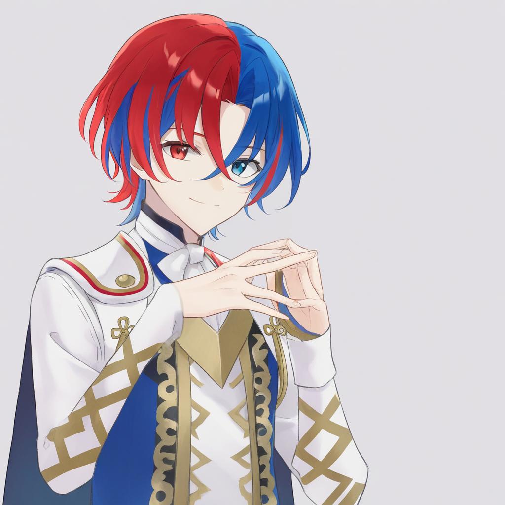 Alear (male) (fire emblem), fire emblem, 1boy, heterochromia, red eyes, blue eyes, hair between eyes, red hair, blue hair, two-tone hair, short hair, split-color hair, crossed bangs, long sleeves, by artist azuuru, leet
