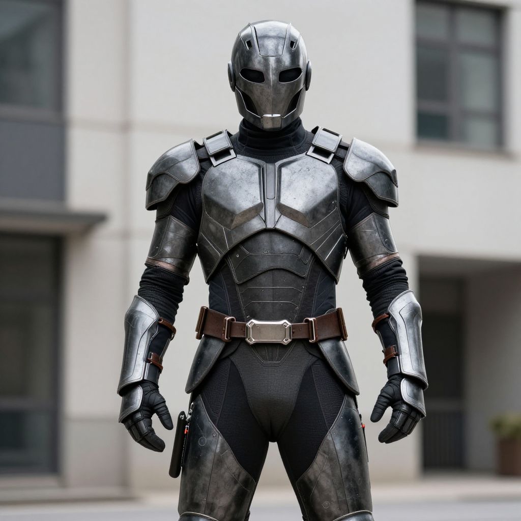 Photograph of a male superhero standing in front of a modern building. He wears a full black metallic armor suit with angular shoulder pads, a chest plate, and a high-collared helmet with narrow, expressionless eye slits. The armor has a matte finish with subtle highlights. A brown belt with a silver buckle is around his waist, and a small black pouch is attached to his right thigh. The background shows a blurred, multi-story building with large windows and a potted plant. The overall scene is urban and futuristic.