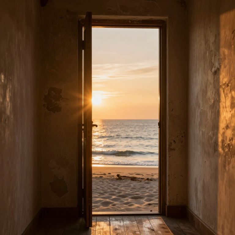 Sunlight streams through a partially open wooden door, revealing a serene beach sunset where the golden horizon meets the calm ocean, casting warm hues across the weathered interior walls and floor.