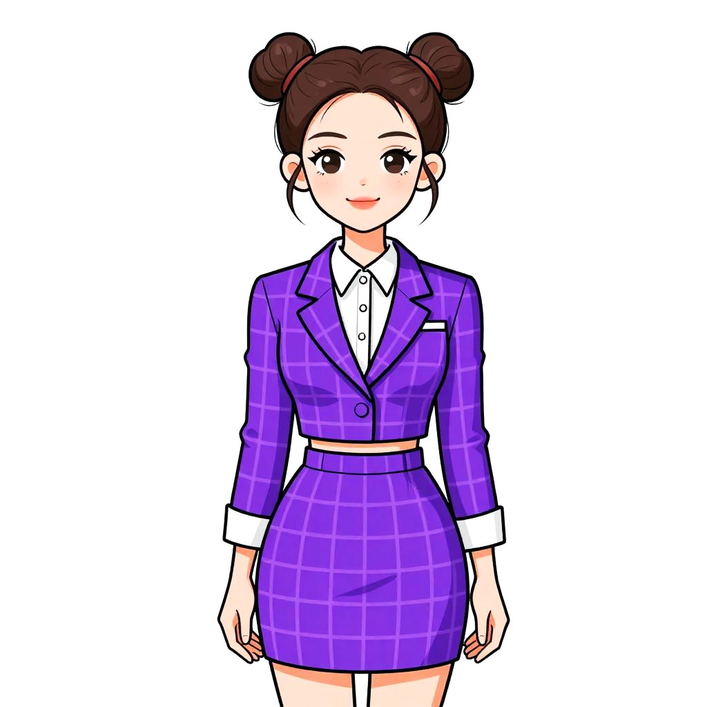 Digital anime-style drawing of a smiling woman with brown hair in double buns, wearing a purple plaid suit with a white shirt.