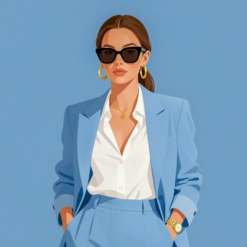 Digital illustration of a confident woman with tan skin and brown hair tied in a ponytail. She is wearing large black sunglasses, gold hoop earrings, a white low-cut shirt, and a light blue suit jacket and matching pants. Accessories include a gold watch on her left wrist and a gold necklace with a small pendant. Her hands are casually placed in her pants pockets against a solid blue background.