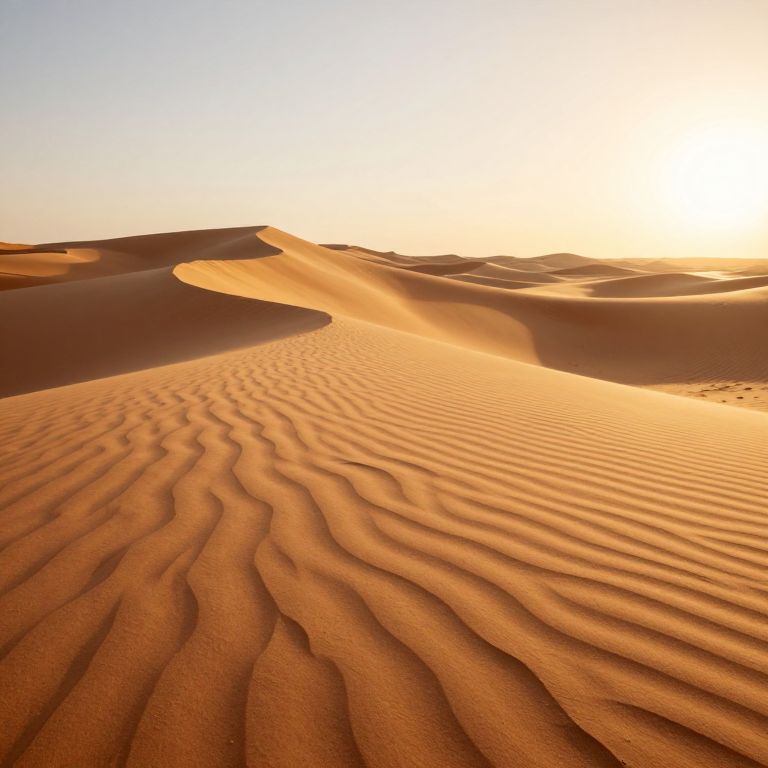 Photograph of a golden desert landscape at sunset, featuring rippled sand dunes with soft shadows, under a bright, glowing sky.
