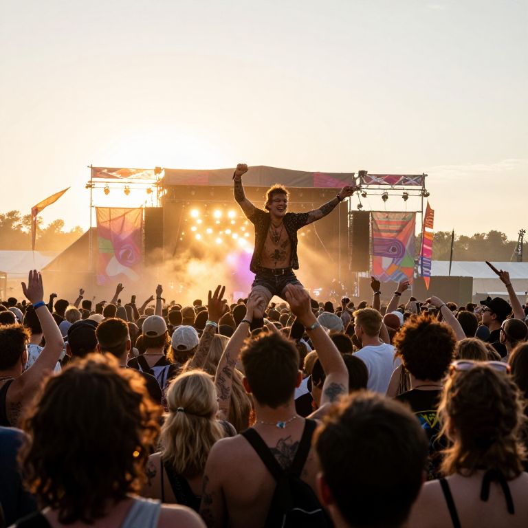 Photograph of a vibrant outdoor concert at sunset. A male performer, with short hair and a muscular build, stands in the center, arms raised, wearing a black, long-sleeve graphic shirt and patterned pants. He is illuminated by bright stage lights that create a warm, orange glow. The crowd, composed of diverse individuals with raised hands, fills the foreground. They wear casual summer clothing, such as tank tops and sunglasses. The background features a large stage with colorful banners and additional lighting. The sky is clear, transitioning from day to night, enhancing the energetic atmosphere.