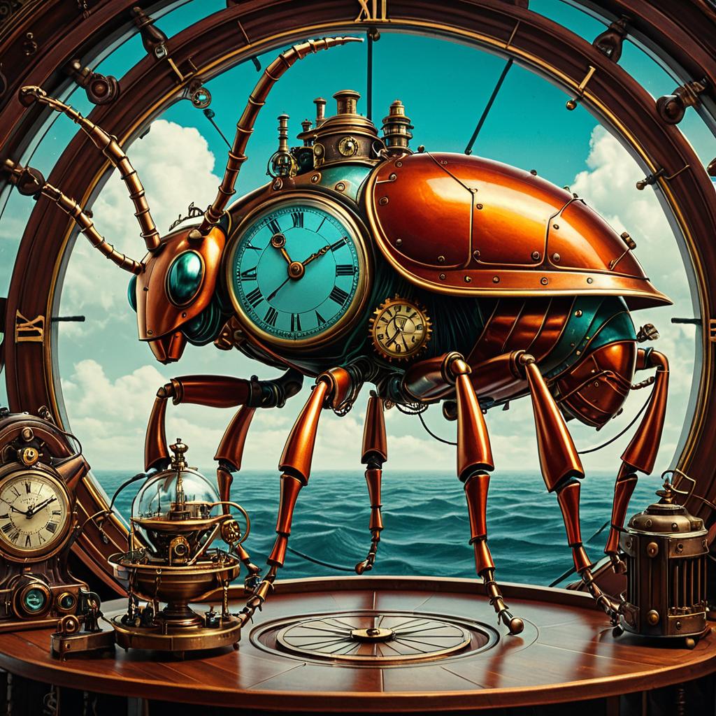 Crimson brass mechanical beetle in a steampunk epic of a skyship captain and a alchemist rendered with trompe-lœil illusionistic detail, clockpunk accents, familiar domestic scenes and lively tableaus in the style of Evgeni Gordiets and Joe Jusko, tinted in deep amber hues and muted teal highlights.