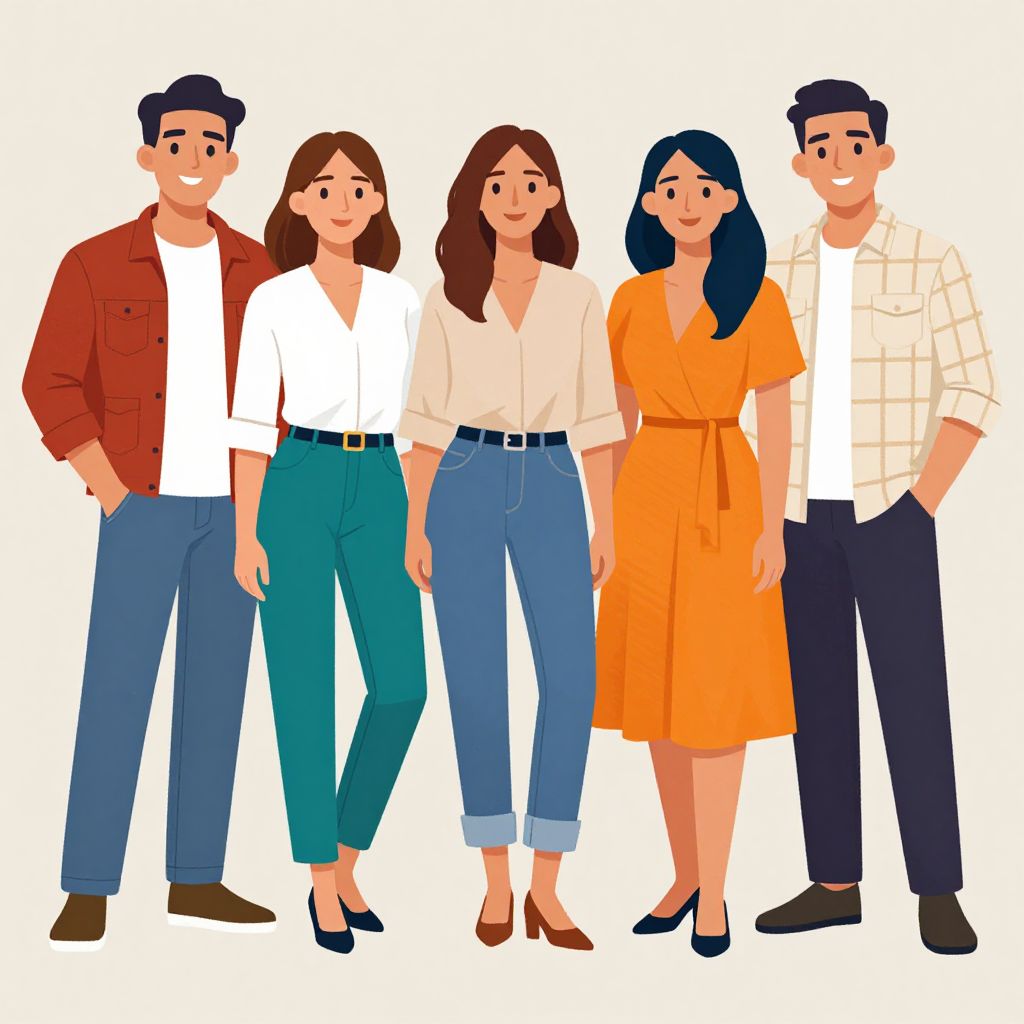 Five hand-drawn figures stand side by side, showcasing diverse styles: a man in a red jacket and jeans, a woman in a white shirt and teal pants, another woman in a beige blouse and rolled-up jeans, a woman in an orange dress, and a man in a plaid shirt and dark pants, all rendered in vibrant colors against a neutral background.