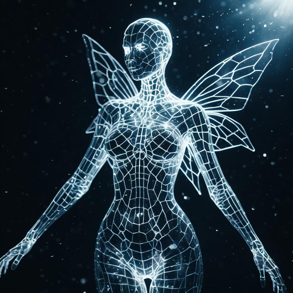 Ultra-detailed digital illustration of a translucent, bioluminescent cyberspace warrior with illuminated grid patterns across the body. The figure features a mysterious, fragmented mosaic design with glowing neon blue lines, ethereal floating parts, and cyberpunk-inspired mechanical elements set against a dark backdrop with dramatic volumetric lighting and motion blur effects.