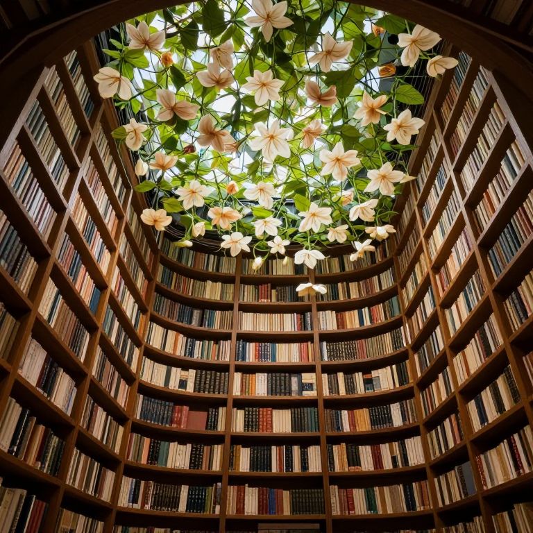 Photograph of a grand, circular library with towering wooden bookshelves filled with colorful books. The shelves spiral upward, converging at the ceiling, which is adorned with a lush arrangement of white magnolia flowers and green leaves. The sunlight filters through the flowers, casting a warm, inviting glow over the books. The image is rich in contrast, with the dark wooden shelves and books juxtaposed against the bright white flowers and greenery. The overall atmosphere is serene and scholarly, evoking a sense of timeless knowledge and beauty.
