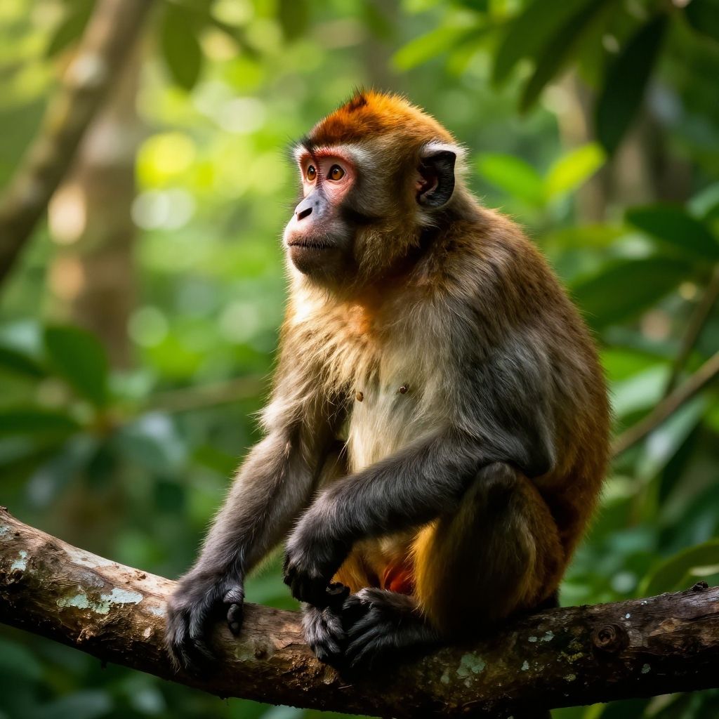 Monkey profile view, sitting on a tree branch, lush green rainforest setting, high detail fur, warm sunlight filtering through leaves, vibrant and lifelike depiction