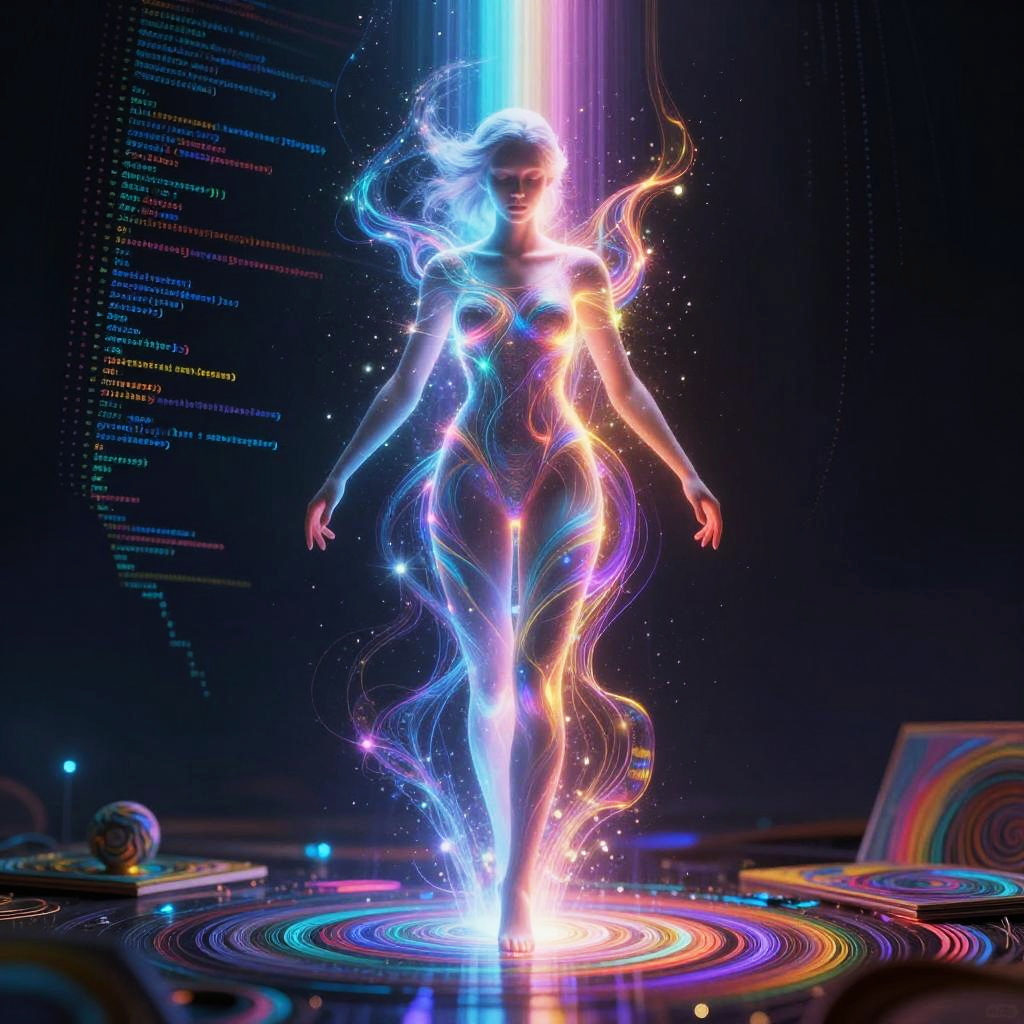 Online AI generator depicted as an ethereal AI entity creating digital art, glowing hands shaping data streams into images, vibrant colors, mystical and high-tech atmosphere, balanced mix of organic and synthetic elements