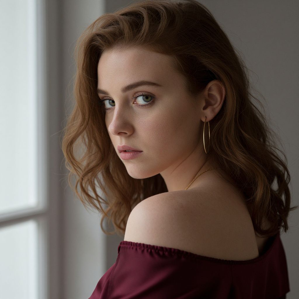 A photorealistic portrait photograph showcases a youthful woman in her early twenties with porcelain skin, distinct high cheekbones, and full lips. Her wavy chestnut hair gracefully falls past her shoulders. The captivating green eyes, fringed by thick lashes, convey a blend of intrigue and melancholy. She is elegantly attired in an off-the-shoulder silk blouse, its deep burgundy hue complementing her fair complexion. Delicate gold hoop earrings and a simple gold chain necklace adorn her. Soft, diffused light from a nearby window gracefully illuminates her face, casting subtle shadows that enhance the depth of her skin tone. The three-quarter view composition accentuates her strong jawline and the natural curve of her neck as she turns away slightly, exuding an aura of mystery and vulnerability.