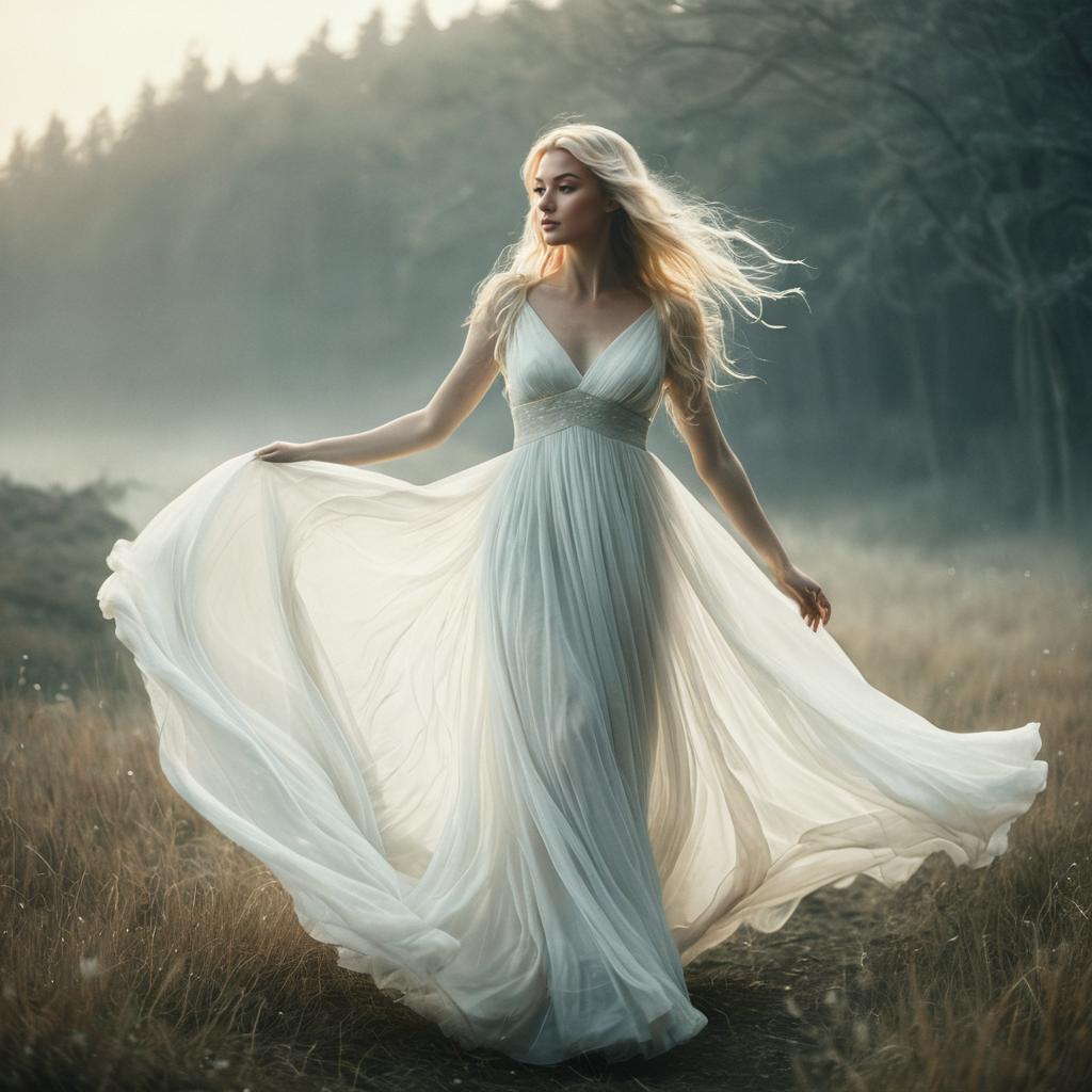 A graceful woman standing in a misty environment wearing a flowing, translucent white dress, her blonde hair glowing with ethereal light as if illuminated from behind, soft and dreamy atmosphere with subtle pastel tones, delicate and luminous highlights on her figure and fabric, gentle movement captured in the flowing dress and hair, fantasy and mystical mood