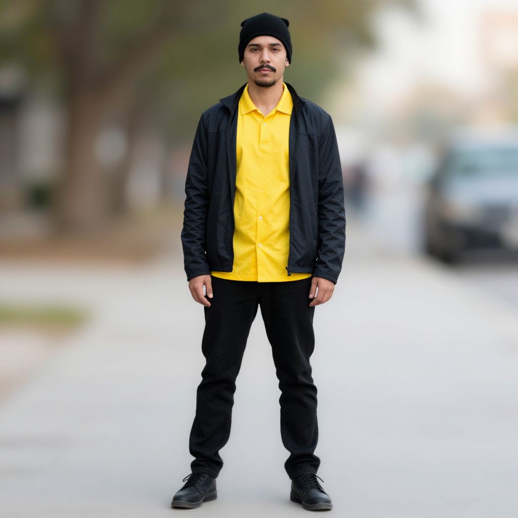 "costume halloween usa, 1boy, male focus, solo, hat, shirt, pants, facial hair, full body, outdoors, standing, black footwear, blurry background, looking at viewer, yellow shirt, mustache, black pants, blurry, collared shirt, jacket, long sleeves, black headwear, realistic Realistic photo of casual sexy person with pretty face"