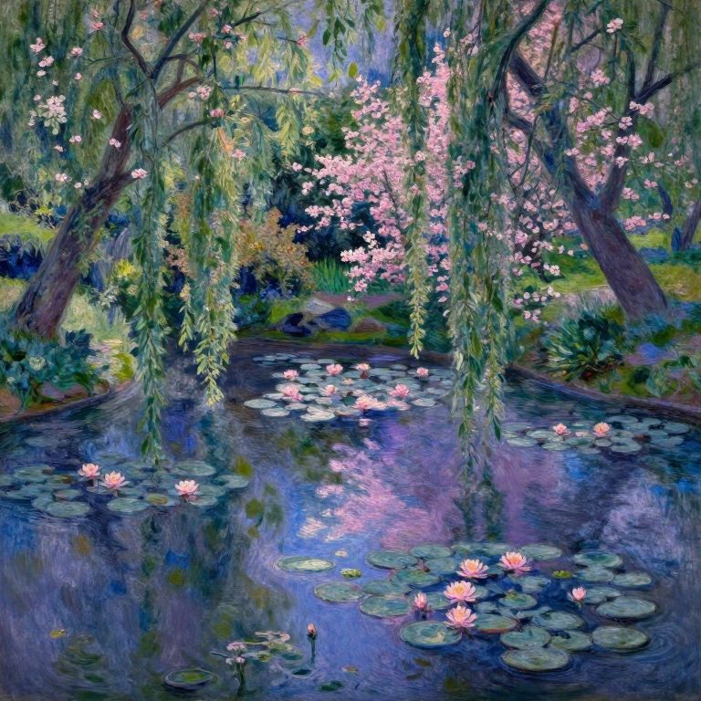 In the serene style reminiscent of Monet's renowned Water Lilies series, create an enchanting garden scene viewed from above a gently rippling pond. Majestic weeping willows frame this captivating view with their cascading branches, adorned in delicate pink blossoms that dance on the water's surface. The soft interplay of light and shadow reflects off the serene pond, bathing the entire scene in an ethereal glow that transitions seamlessly between rich hues of blue and violet. This impressionistic masterpiece captures the fleeting beauty of nature, evoking a sense of calm and enchantment within its intricate composition.