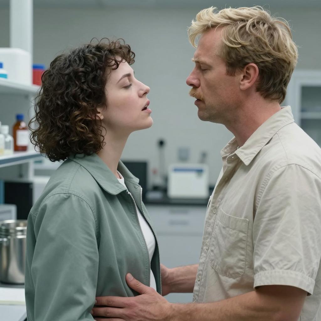 A color photograph of a man and woman in a laboratory. The woman with short, curly dark hair, pale skin, and a light green jacket leans back, eyes closed, mouth slightly open. The man with blond hair, tan skin, and a beige shirt stands close, eyes closed, mouth slightly open. They are facing each other, with the man's hands on her waist. Laboratory equipment, including metal containers and a red bottle, is in the background. The man has a mustache. The woman's expression is intense, and the man's expression is intense. Two people.