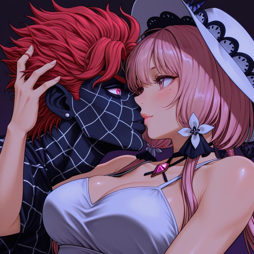 Digital anime-style artwork depicting a close embrace between two characters. One character has striking red spiky hair, dark skin with a white web-like pattern, and bright pink eyes. The other character has pink hair, pink eyes, and is wearing a white hat adorned with black and white details, along with a sleeveless white top and a black choker with a pink gem. The intimate pose captures a tender moment between the two characters.