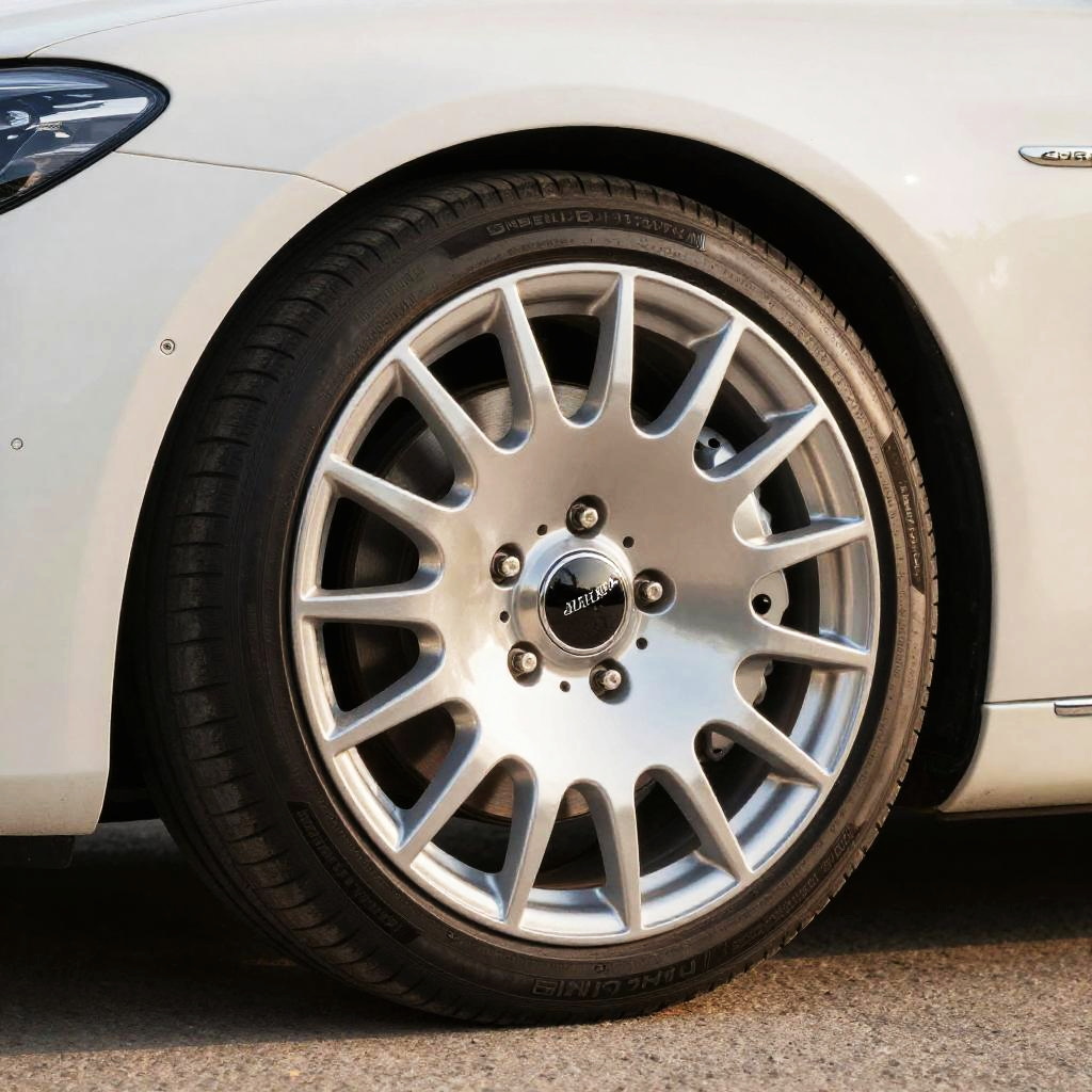 Vintage inspired S class Maybach rims, showcased in a high-resolution close-up with soft natural sunlight, classic yet modern multi-spoke rim pattern, sitting on a pristine white luxury car, emphasizing timeless elegance and exquisite metallic finish