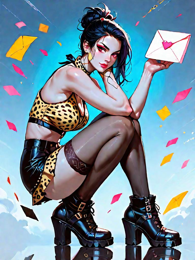 Digital artwork of a full-body shot of an edgy young woman with a realistic face, wearing a leopard print halter top with a deep V-neck and sleeveless design, paired with a black faux leather mini skirt. She has black lace stockings and chunky black heeled boots. Her dark hair is styled in a messy bun with red and white accents. She is holding a white envelope clutch with a pink heart seal, surrounded by colorful falling envelopes against a blue sky background.