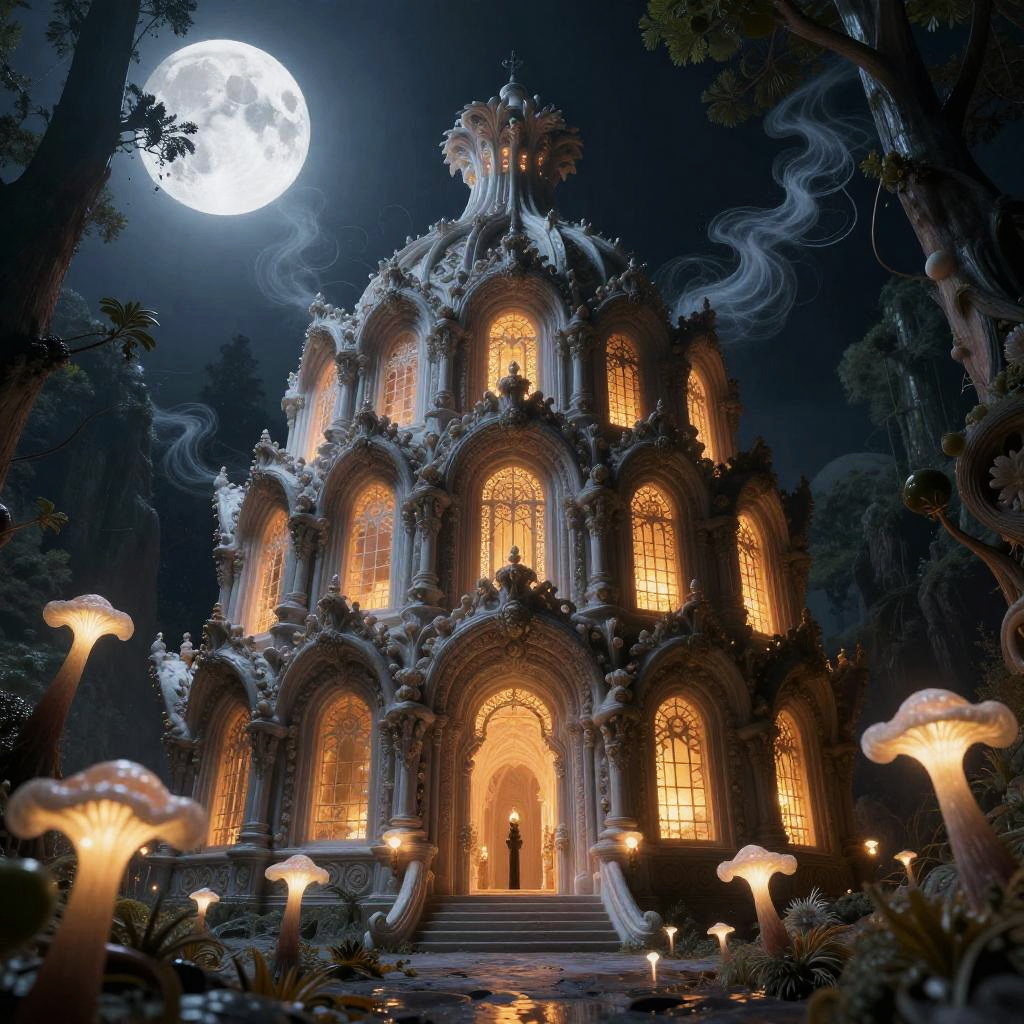 An ultra-detailed, photorealistic depiction of a bioluminescent cathedral shaped like giant fungi in a moonlit phosphorescent valley. The baroque-style structure features glowing mushroom-shaped towers and intricately carved organic elements, illuminated warmly from within. The scene is set at night with a full moon in the sky and drifting spores adding to the mystical atmosphere, inspired by Gustave Doré's artistic style.