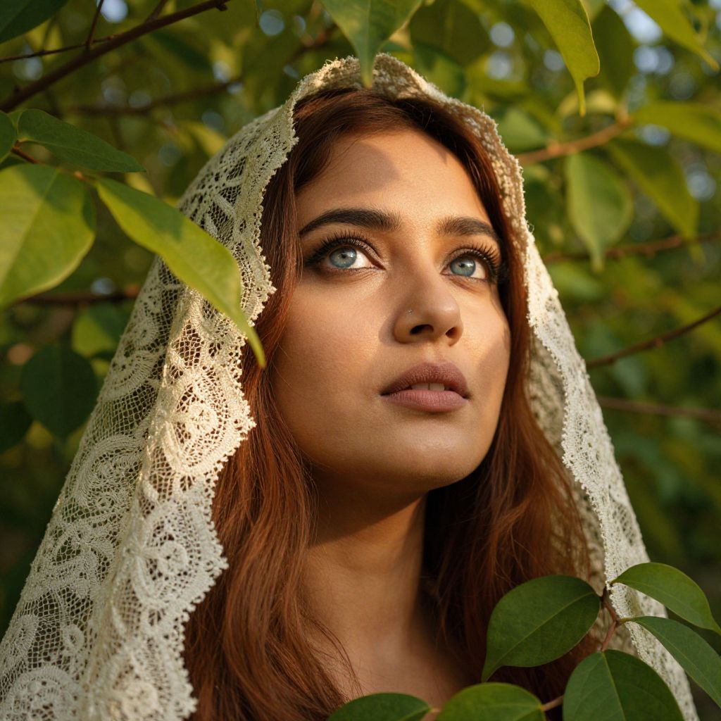 A portrait photograph, taken from a low-angle perspective, captures the enigmatic presence of a South Asian woman with piercing blue eyes and chestnut hair. Her delicate features, highlighted against vibrant green foliage, are illuminated by warm golden sunlight filtering through an intricate lace veil. The soft interplay of light and shadow across her porcelain skin evokes a sense of tranquility and introspection, while the surrounding leaves add ethereal texture to this mesmerizing fusion of natural beauty and human grace.