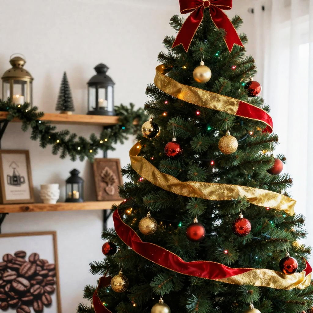 Decorated Christmas tree with colorful lights, red and gold ribbons, green garland, and ornaments. Background has a wooden shelf with lanterns, green garland, and rustic decorations. Sign on left shows close-up of coffee beans and . Bright, warm indoor setting.