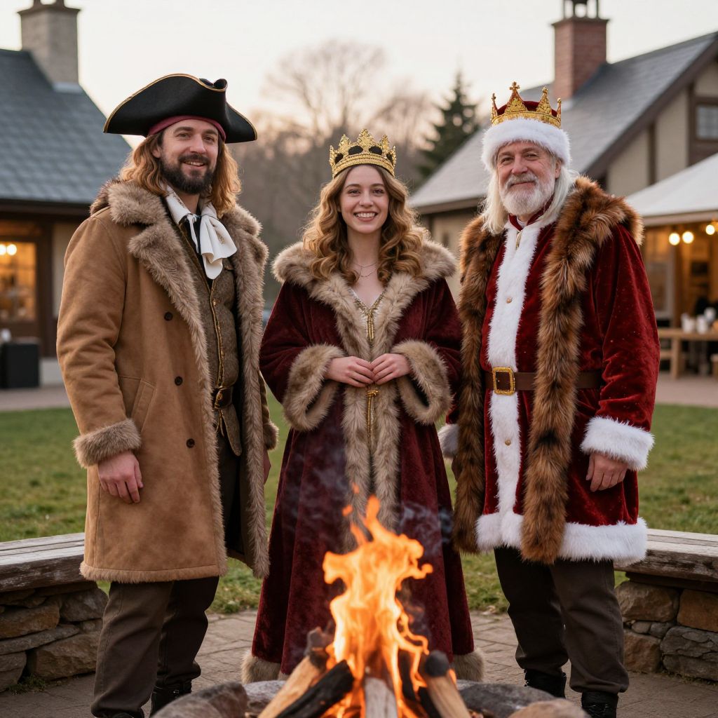 A cheerful outdoor group photo featuring three people in warmest winter coats, each wearing a unique costume element—such as a pirate hat, a queen's crown, and a Santa outfit—wearing rich, fur-lined coats in earthy tones, standing around a winter-themed bonfire in a cozy village park, soft golden hour lighting