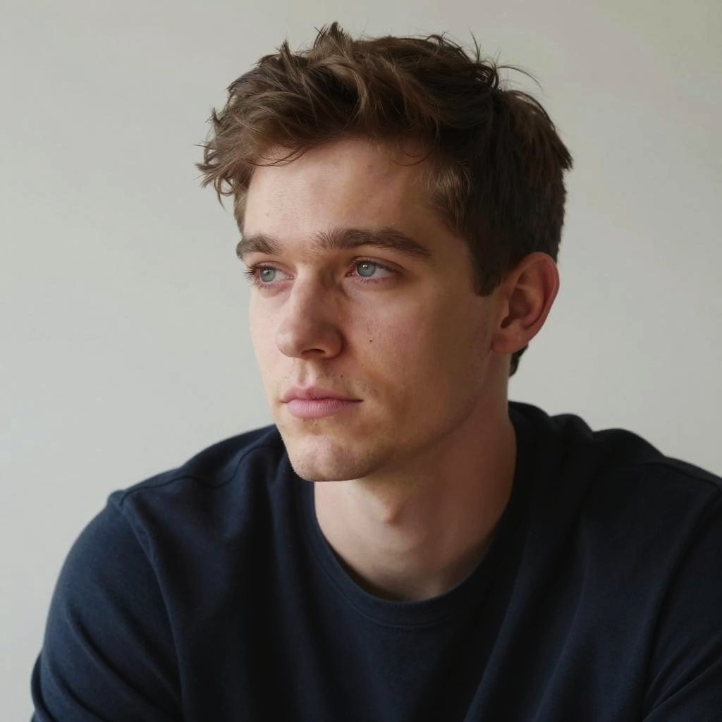 Portrait of a young Caucasian man with a light beard and neat hairstyle wearing a black leather jacket and black t-shirt, looking directly at the camera. The background features a soft gradient of pastel colors including pink, beige, and light blue.