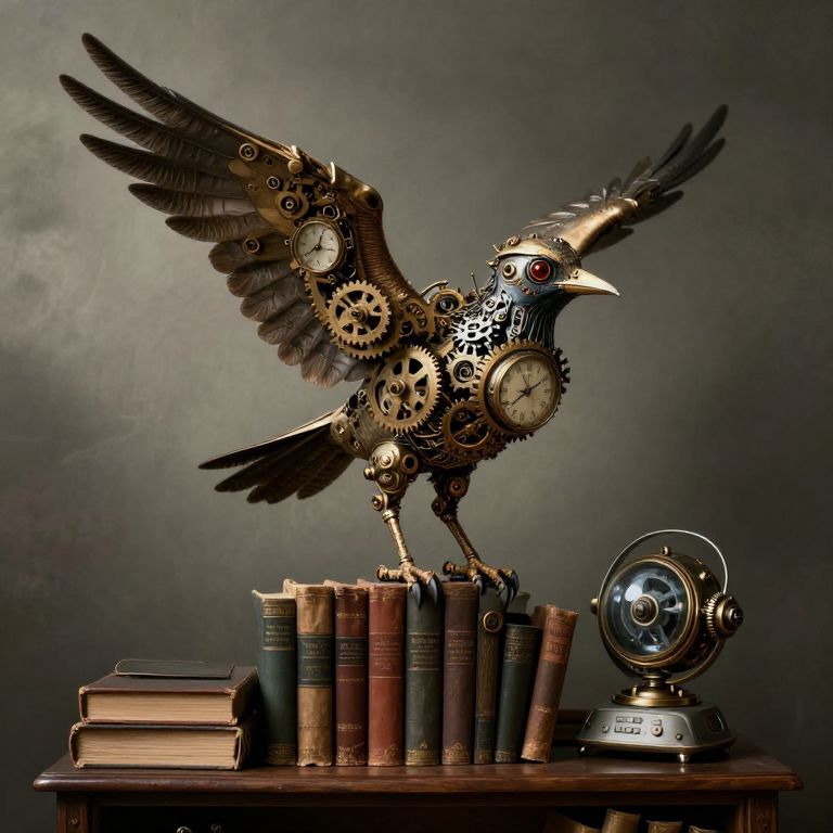 Create an enigmatic digital art composition reminiscent of surrealism, featuring a steampunk-inspired bird with clockwork wings perched atop a bookshelf housing antique volumes and futuristic devices. The avian's gears and cogs replace its natural appendages, coming to life as it defies gravity within this mechanical marvel. Soft, diffused light from an unseen source highlights the scene, casting dramatic shadows that accentuate contrasts between organic and mechanical elements, inviting viewers into a world of mystery and wonder.