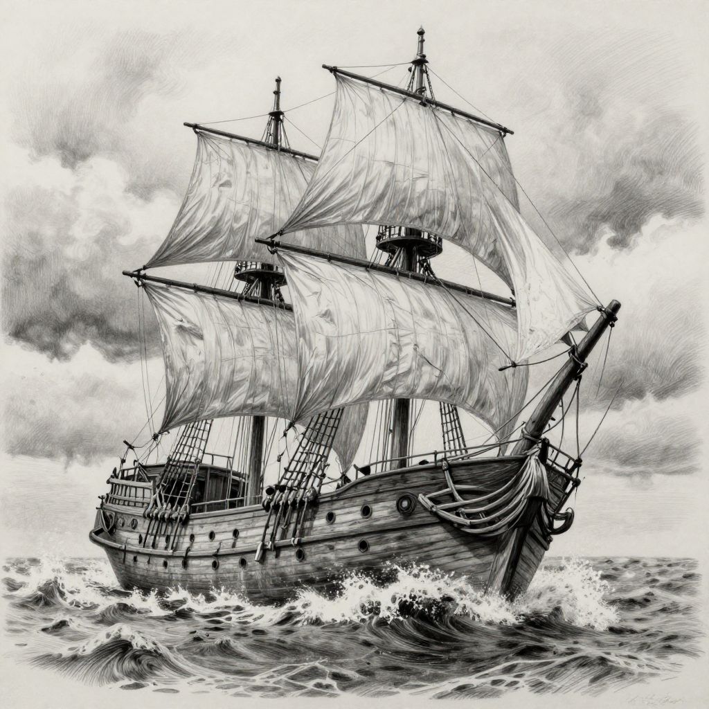 Detailed black-and-white ink drawing of a traditional sailing ship with billowing sails, navigating choppy waters under a cloudy sky.