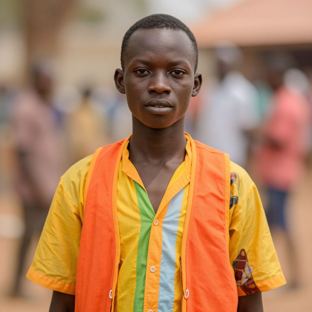 Photograph of a young African boy with short hair, wearing a yellow and green shirt with an orange vest, standing outdoors with a blurred background of people