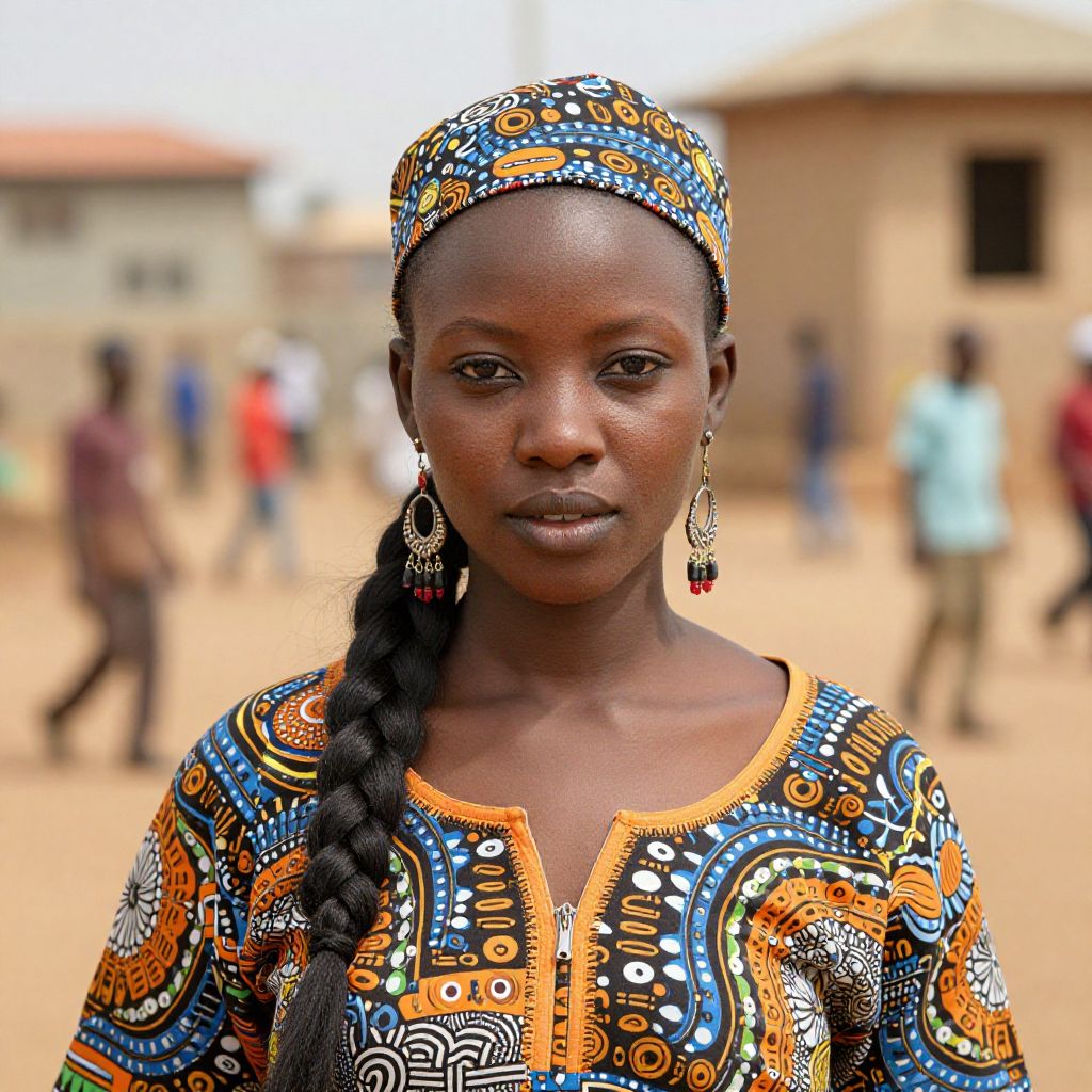 Photograph of a young African boy with short, neatly cropped hair and dark skin, standing outdoors. He wears a bright yellow, short-sleeved shirt with a green and blue vertical stripe, and an orange vest hanging over his shoulders. His expression is serious, and he gazes directly at the camera. The background is blurred, showing indistinct figures and structures, suggesting a busy, possibly rural setting. The colors are vivid, with the boy's yellow shirt and orange vest standing out against the more muted background. The image captures a moment of stillness amidst a bustling environment.