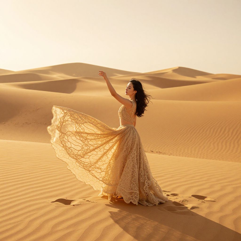 Ethereal woman twirling gracefully in flowing golden lace, her dress billowing against the vast expanse of undulating sand dunes under a warm, golden sky.