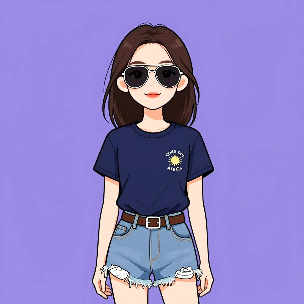 Illustration of a young woman with long brown hair wearing oversized aviator sunglasses, a navy blue crew neck t-shirt with a sun graphic and text on the front, high-waisted frayed denim shorts, and a brown leather belt with a metallic buckle. The background is solid purple.