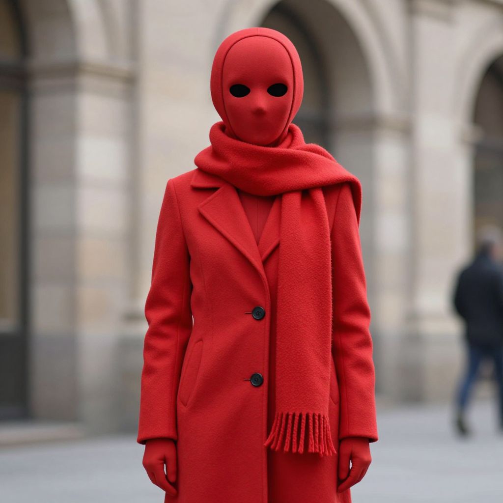 Photograph of a person standing in an urban outdoor setting with blurred stone arches in the background. The individual is dressed in a bright red, double-breasted coat with black buttons, and a matching red scarf with fringes. They also wear a red, full-face mask with black circular eye holes, concealing their identity. The person's hands are visible, clad in red gloves. The street is slightly out of focus, with a blurred figure walking in the background. The overall image has a surreal, almost anonymous feel, emphasizing the bold red color against the muted, gray-toned architecture.