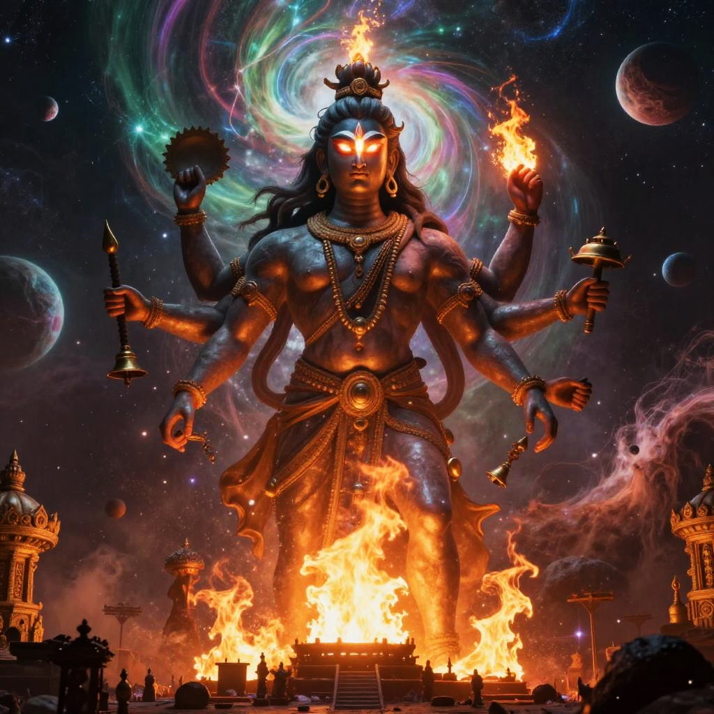 Shiva – The destroyer and god of transformation, shown as a fearsome deity with a third eye burning with divine fire, standing in the forge at the heart of a nebula — a cathedral of stellar flame where auroral currents and stellar winds shape newborn planets and drifting meteors ring like temple bells.