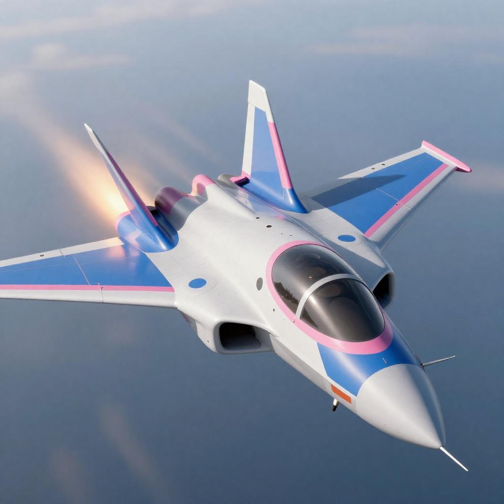CGI image of a colorful, anthropomorphic jet character with blue and pink accents, flying at high speed. The jet's nose is pointed forward, with glowing red and yellow lights in the background. The character's arm is extended, and the scene has a dynamic, action-packed feel.