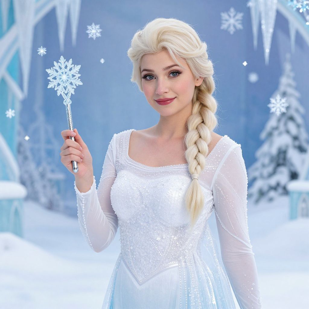 A realistic photo of a young woman in her late teens, with soft blonde hair and clear blue eyes, wearing a classic Elsa white dress costume from the Frozen movie. She stands in a winter-themed snow-covered courtyard with glowing snowflakes and icicle decorations in the background, holding a small enchanted ice pick in her hand, posing gently with a serene smile.. The woman has big tits and cute face