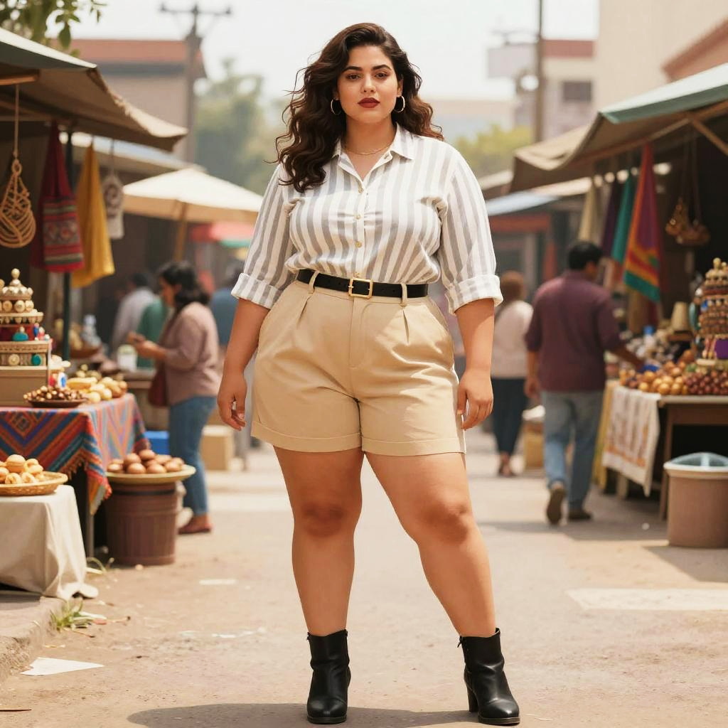 A Pear-shaped body type woman in a boho-chic cream lace dress with tribal patterns and a flared skirt, paired with brown leather ankle boots and a multi-colored woven shoulder bag, enjoying delights at a festive market, illustrated in a vibrant image comics style. Sexy. Pretty face and beutiful eyes