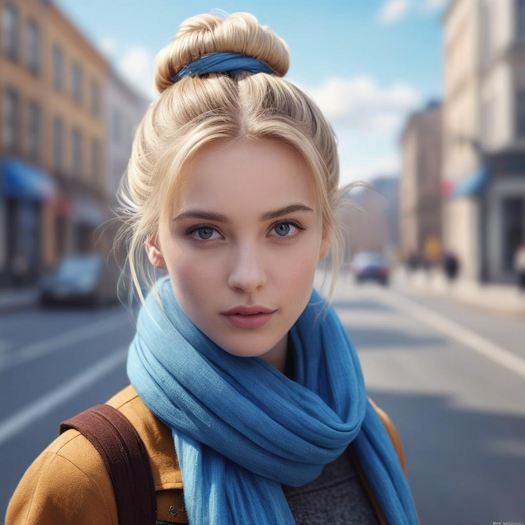 1girl, blonde hair, blue eyes, scarf, solo, looking at viewer, realistic, blurry, lips, upper body, outdoors, photorealistic, blurry background, street, single hair bun, watermark, road, hair up, building, artist name, depth of field