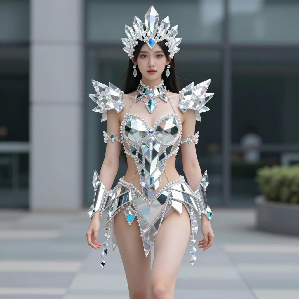 Portrait of an Asian woman wearing a futuristic cosplay costume made of reflective, segmented material designed to resemble shining crystals. The outfit includes a geometric headpiece, sharp shoulder armor, and intricate arm accessories, capturing a sci-fi and fantasy fusion style. She is walking outdoors against an urban background, showcasing the artistic and detailed design of the crystal-inspired attire.