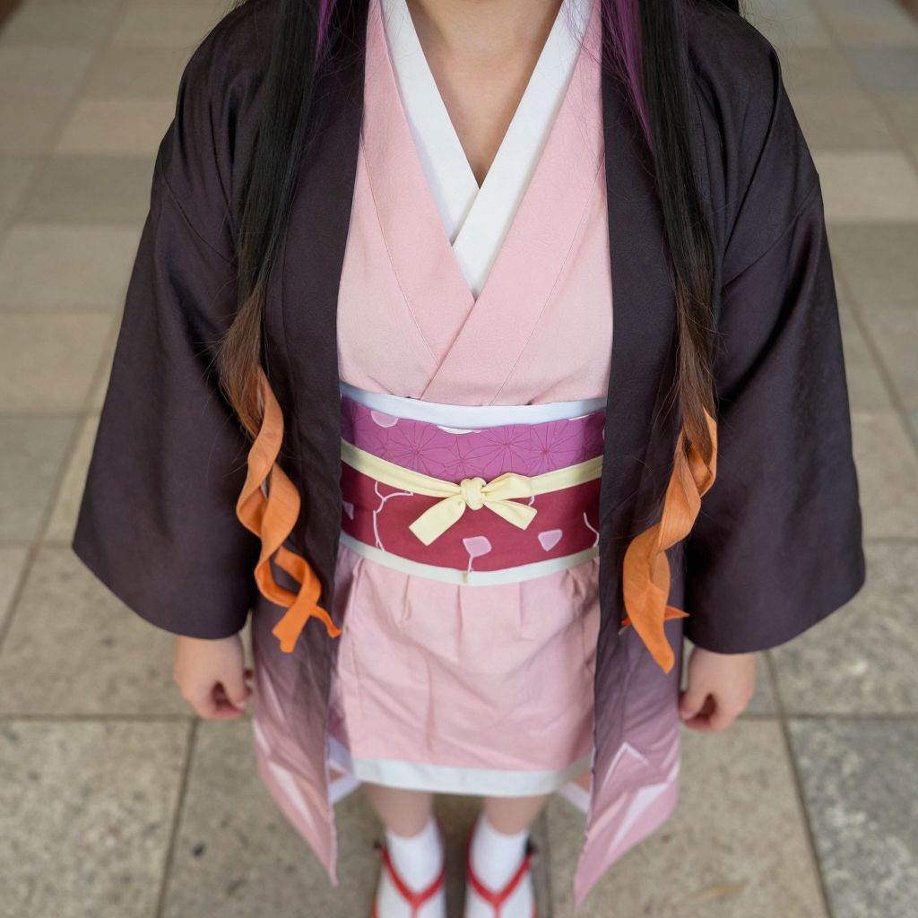 Nezuko Chan Costume, a close up of a person in a costume standing on a stone floor