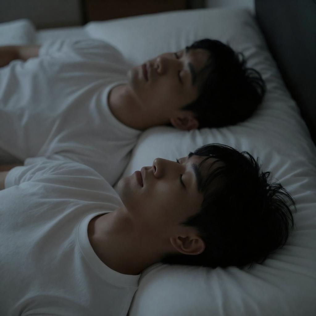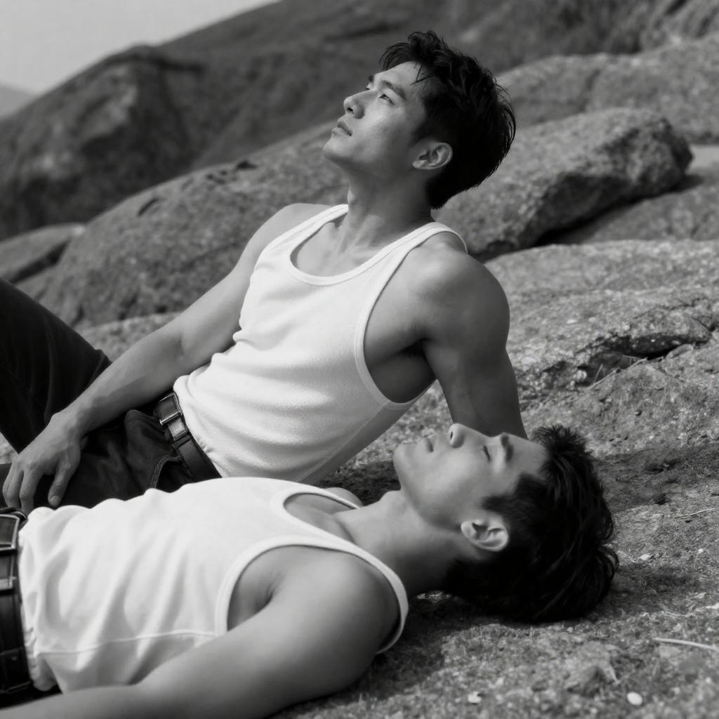 Black-and-white photograph of two men in a rocky landscape. Upper man with short dark hair, muscular build, wearing a tank top, looking upwards. Lower man with short dark hair, lying down, head tilted back, eyes closed. Rocky hillside background. Upper man's left hand rests on lower man's chest. Lower man's right arm is outstretched. Contrasting shadows and ures.