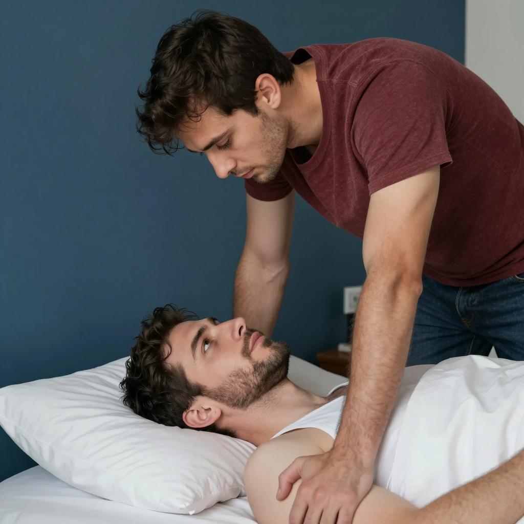 Two men in a bedroom. Man lying in bed with short dark hair, beard, and white pillow, looking up. Man standing beside bed with dark hair, wearing red shirt, leaning forward, looking down. Blue wall in background.