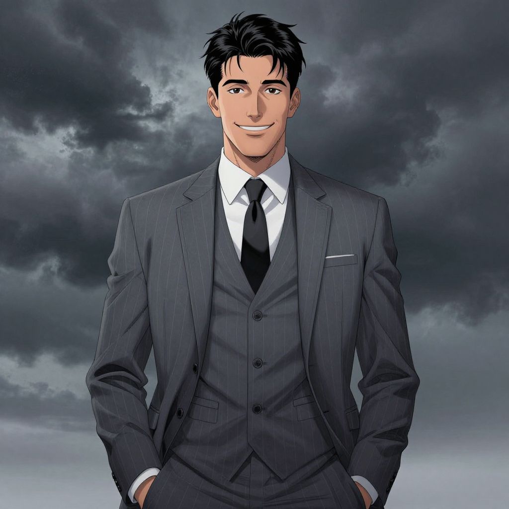 A portrait of the character, desire, a tall smiling androgyne with black hair and a grey pinstripe suit, vertigo comics, the sandman written by neil gaiman, against a stormy sky